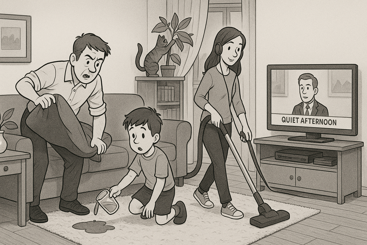 この画像はGPTを用いて作成しています。画像のように複数の出来事が同時に起こっている画像を利用することで、説明することでができる箇所を豊富に用意しました。これにより、回答欄の大きさなどの要因が記述量に及ぼす影響を観測しやすくする狙いがあります。