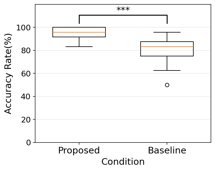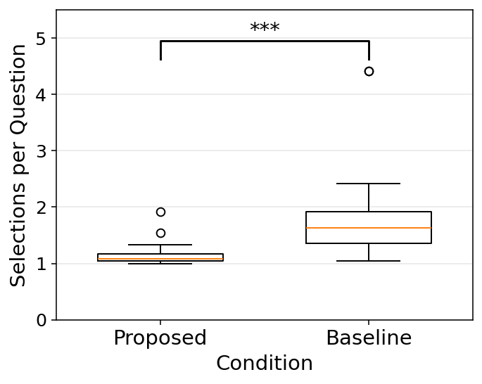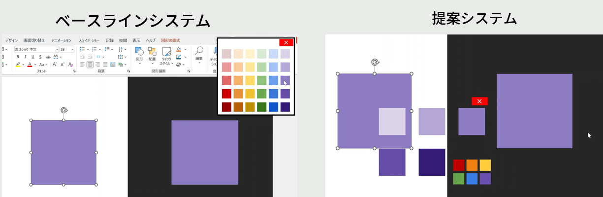 この手法の有効性を検証するために,色合わせタスクを実施しました.提案したパレットと,ベースライン手法であるPowerPoint内のパレットを模したシステムについて,正答率,色の選択回数,解答時間を比較しました.