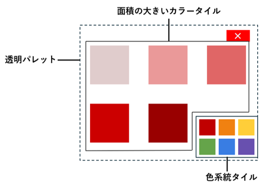 大きな特徴は2つあり,まず,パレットの背景が透明である点です.これは,カラータイルの周辺の色によりカラータイルの見た目の印象が変化しないようにするためです.そして,色の表示面積が大きいという点です.これは,一度に表示する色系統を制限することで実現させています.