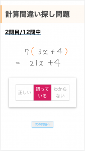 正誤判定実験では不正解の問題も提示しますが、前の実験では間違え箇所がバラバラであることがノイズとなってしまいました。そのため、本実験では分配法則を行うときに誤りがちな符号ミス(符号を変え忘れる)と分配忘れ(かっこ内の遠い項に掛け算し忘れる)に絞って調査を行いました。