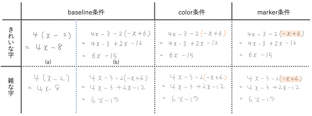 上図の左から、何もハイライトされていないbaseline条件、かっこに色がついたcolor条件、かっこ内にマーカーが引かれたmarker条件となっています。また、提示される計算式は私が実験用に手書きしたものになりますが、前回の実験で雑な字ではどうなるかという話があがりました。確かに、実際の計算場面では早く頭の中に浮かんだ計算を書き記したい!という思いから速記になり、雑な字になってしまう可能性があります。雑な字はよりいっそう構造が分かりにくくなり、ハイライトが効果的に働く可能性があると考え、「きれいな字」と「雑な字」の2種類の文字形状を用意しました。