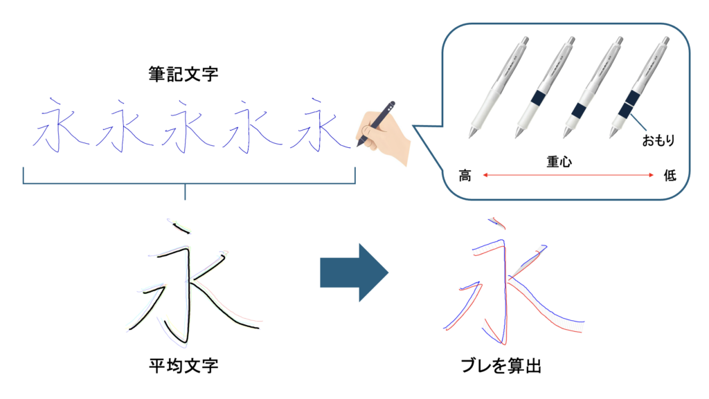 これに対し、これまでに研究室では、先輩の能宗さんがペン先の摩擦特性に着目した書き心地と筆記のブレの相関について調査してきました。ここで、筆記のブレに関しては、ユーザによって筆記された複数の文字を平均化した文字はユーザの理想に近づくという先行研究に基づき、ユーザの平均文字を理想文字と仮定し、平均文字と各筆記文字の差分を筆記のブレと定義しています。