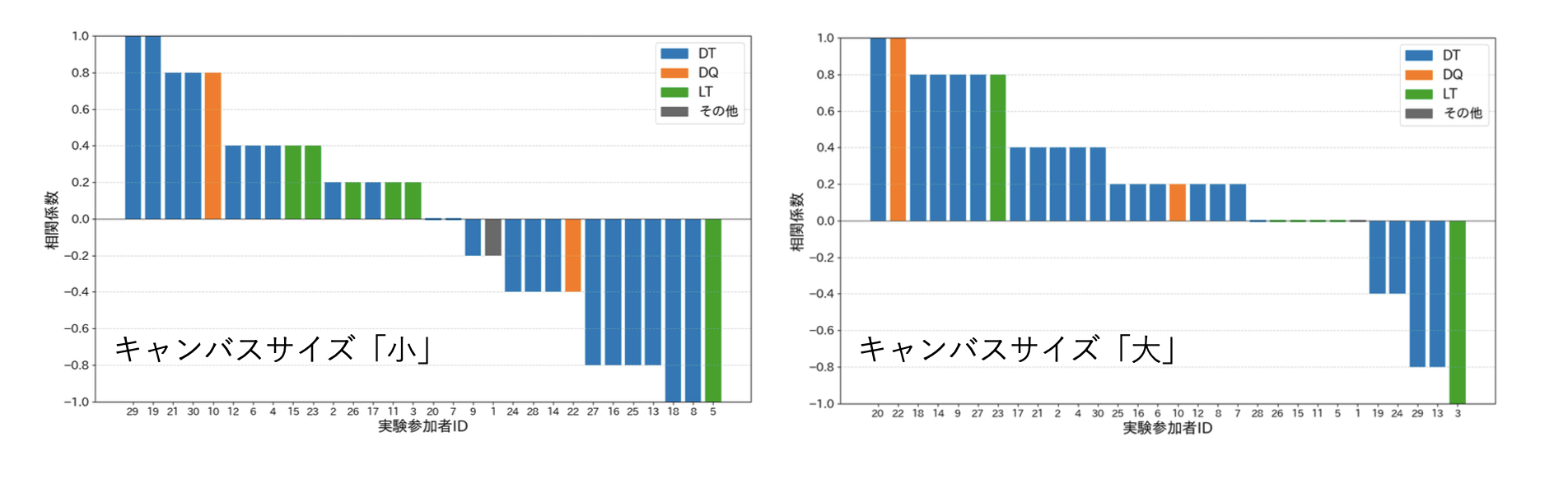 書き心地とブレの相関については、参加者の利き手やペンの持ち方ごとに分析を行った結果、左利きの参加者や、ペンを直接支える指の本数が少ない持ち方の参加者など、筆記動作における安定性が低いと考えられる参加者の属性においては強い相関が確認されました。また、文字の縦横比については、キャンバスサイズや筆記する文字の種類などによっても影響を受ける可能性が示唆されました。