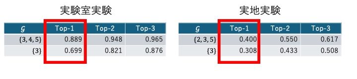 評価指標はランキングの上位k位以内に正解が含まれた割合であるTop-k精度を使用しました。Top-1精度に着目すると、実験室実験という静止したペンギンの腹部模様を模写する実験では約19%の改善が見られました。また、実地実験という水族館の展示で動き回るペンギンを描画する実験では約10%の改善が見られました。このような結果から、異なるグリッドを用いることで描画の揺らぎを捉えることができることがわかりました。