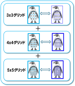 従来ではペンギンの腹部を3×3分割することで、描画した斑点を9要素のベクトルに変換していました。しかし、前述した問題は分割した境界付近に斑点があり、点のゆらぎが生じてしまうというものでした。