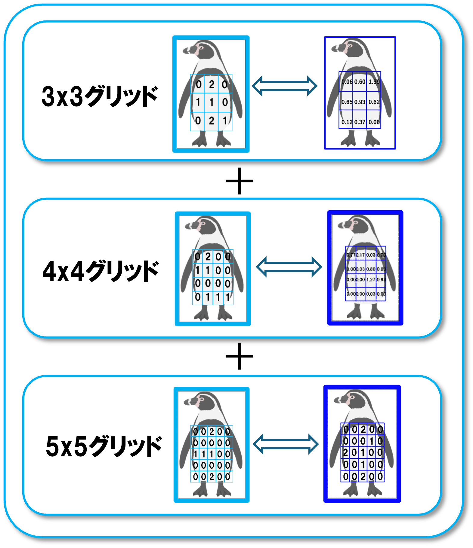 問題を解決するために、3×3だけではなく2×2や4×4、5×5の分割を使用することで境界線上のゆらぎを考慮しました。それぞれの分割でベクトルに変換し、展示されている全ペンギンのベクトルとの類似度を計算してランキングにします。
