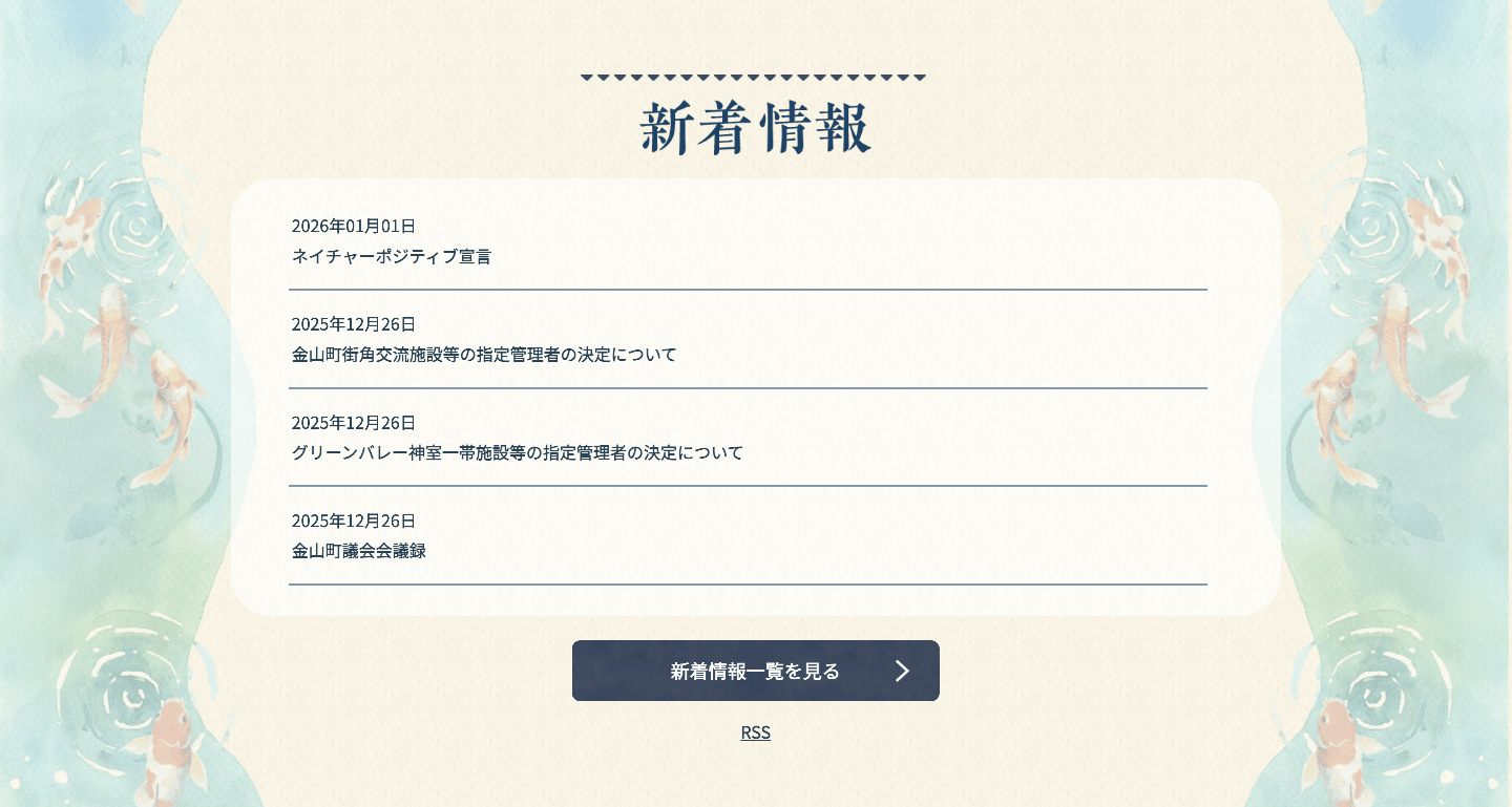 視覚的特徴の乏しいテキストリンクの見落とし:下線や枠線といったクリックを誘発する視覚的な手がかりがないテキストの場合、人間は「新着情報の一覧を見る」などの文脈からリンクだと判断できても、VLMは見落としてしまう傾向がありました。(下の画像の「ネイチャーポジティブ宣言」や「金山町街角交流施設等の指定管理者の決定について」などの部分)