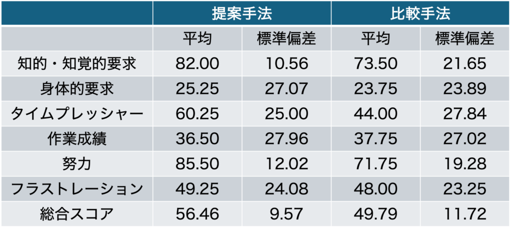 手法による認知負荷を調べるために、手法間のRaw-TLXを調べました。Raw-TLXとは、NASAが開発した、作業の精神的負荷を主観的に評価する手法であるNASA-TLXの算出方法を簡略化したものです。結果として、作業成績以外の項目で提案手法が高くなったため2つ目の仮説通りの結果になりました。