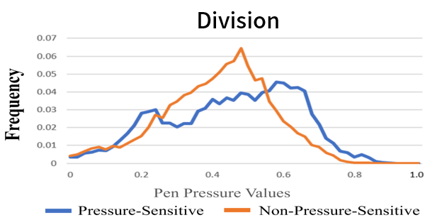 また、割り算における各条件の筆圧分布を分析したところ、筆圧あり条件では筆圧が広く分布しているのに対して、筆圧なし条件では比較的狭い箇所に分布していることが分かりました。この結果より、筆圧が文字に反映されないと筆圧を使い分けようとしなくなるという行動の傾向が示されました。