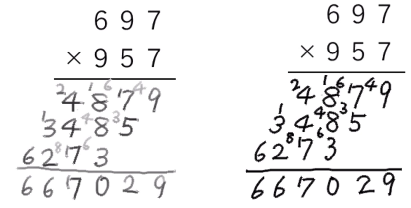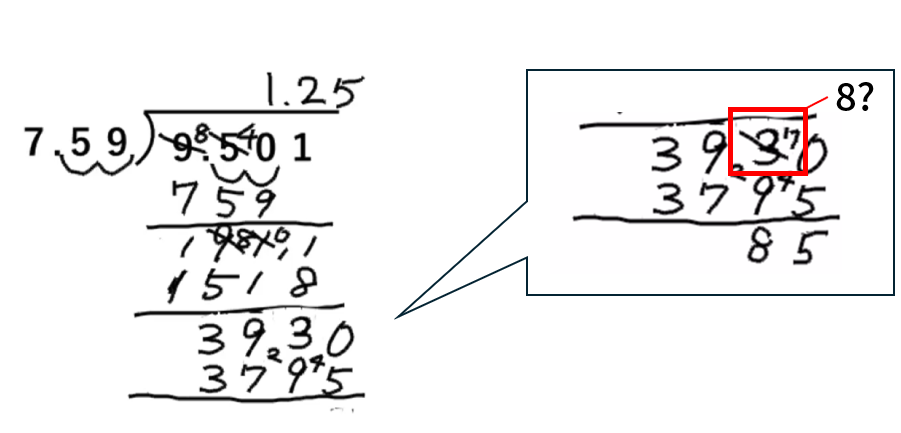 本来、3の繰り下がり後は2と書くのが正しい答えですが、この解答では7と書いています。これは、3に書いた繰り下がり線が8に見えてしまい、7に繰り下げてしまったからだと考えられます。このような視認性の悪さが問題解答において悪い影響を及ぼしています。