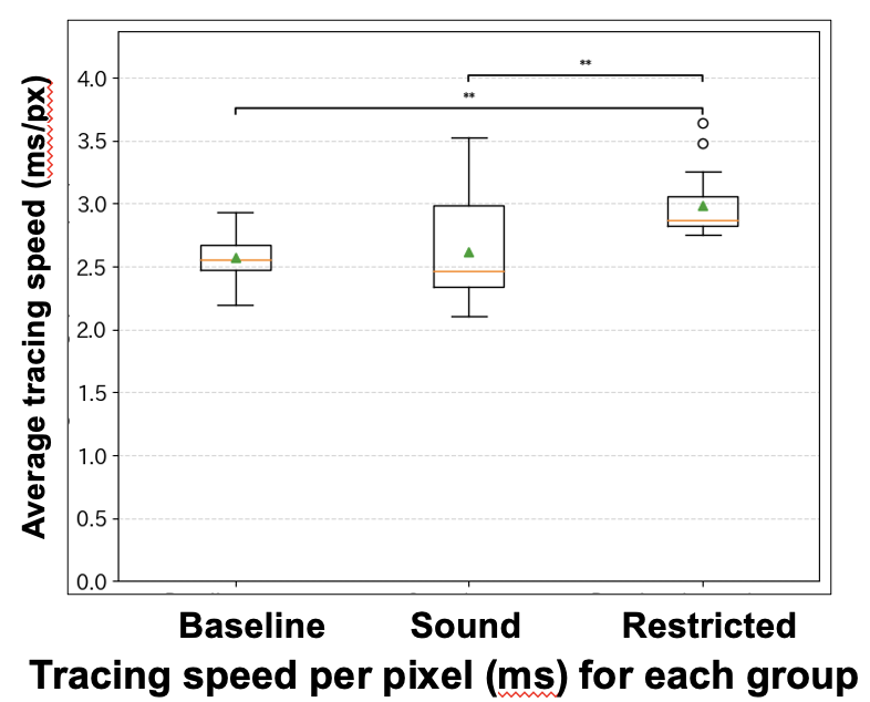 実験では改良版と先行研究のものに加え,同じシステムの音無し版の3種類について比較しました.実験の結果,改良版では他2つに比べ,文字をなぞる速度が有意に遅くなることが明らかになりました.これは,お手本から離れると音が止まってしまうため,常に音が鳴るよう注意して書くようになったからだと考えられます.