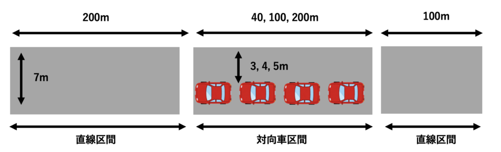 実験は、上記のようなコースをVR空間上で再現し、ドライビングシミュレータを用いて行いました。コース自体の幅は7mで固定し、対向車によって狭まる幅(3m, 4m, 5m)と経路長(40m, 100m, 200m)の組み合わせの9種類があります。さらに、対向車の速度(0km/h, 60km/h)の条件も加えた2*9=18条件で実験を行いました。
