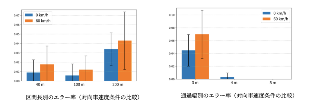 上記の図は、各区間長と通過幅における走行時のエラー率を示したものです。左の図からどの区間長の条件においても、対向車の速度が0km/hの条件に比べて、60km/hの条件の方がエラーが多いことがわかりました。また、右の図からほとんどのエラーが通過幅 3mの条件で発生していることがわかりました。