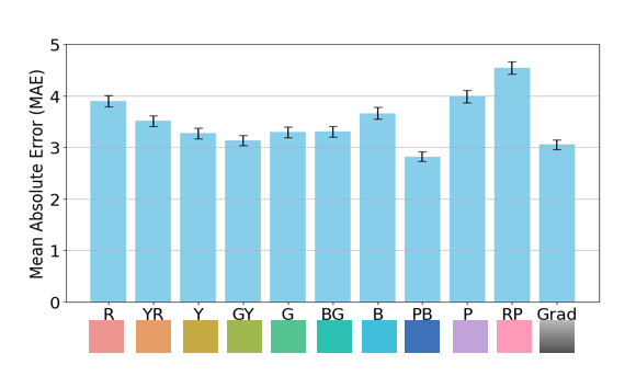 簡単に結果をお話ししますと、まず、枠の色に関して、PB条件という青と紫の間に該当する色の誤差が最も小さくなり、RP条件という赤と紫の間に該当する色の誤差が最も大きくなりましたが、色ごとの特徴は大きく表れませんでした。