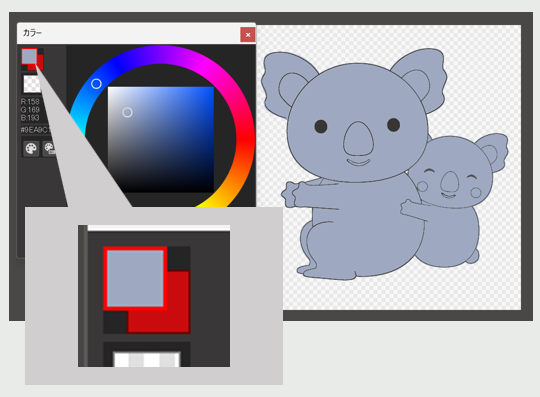 まず、色選択インタフェースの背景について、ソフトによってはダークモードという背景色を黒色にする機能があります。このモードを適用すると、選んだ色が意図したものより暗く見えてしまいます。