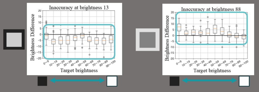 左側が暗い条件、右側が明るい条件を指しています。横軸がターゲットの明るさを、縦軸がターゲットと選んだ色の差を表しています。値が低いほどターゲットより暗い色を選び、高いほどターゲットより明るい色を選んだことを示しています。