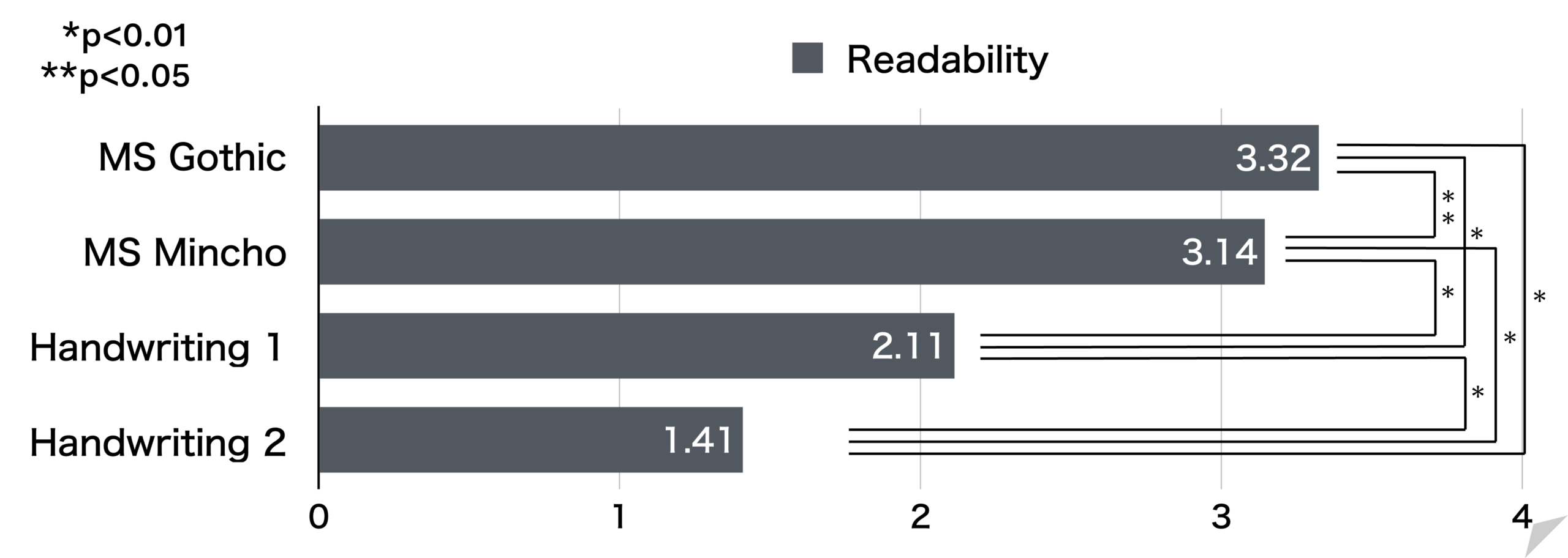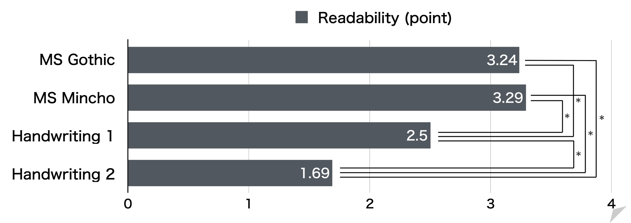 読みやすさでは有意差が見られる一方、読解問題の正答率には差がないという結果が得られました。