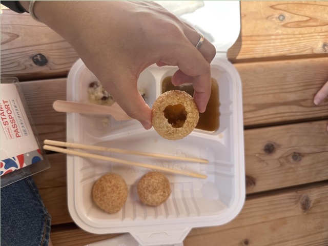 この写真はバーラト(インド)パビリオンのご飯屋さんで買った「パニプリ」です。あんまり日本で食べられていないものを食べようという気持ちと、パニプリの語感の可愛さに惹かれて買ってみました。豆ポテトパクチーをこの丸の中に入れて、スパイスの効いたスープを中に入れて食べるみたいです。